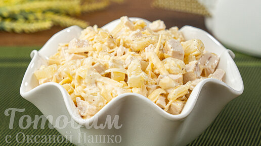 Простой и вкусный салат на все случаи жизни, который готовится буквально за 5 минут. Салат с курицей и ананасами в особенности придется по вкусу тем, кто любит необычное сочетание мяса и сладких фруктов в еде. В нем гармонично сочетается ароматное куриное филе, солоноватый сыр и сладкие сочные ананасы, а чесночок придает легкую нотку пикантности. Это необыкновенно вкусное сочетание! Такой салат прекрасно подойдет как на каждый день, так и на праздничный стол.