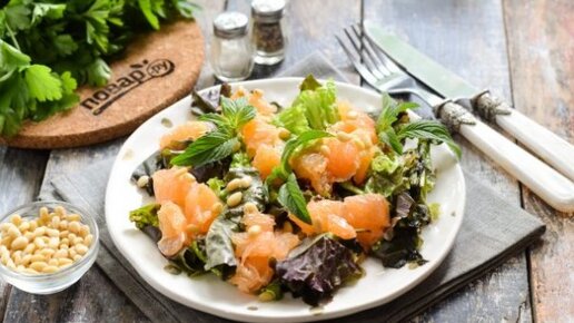 Описание приготовления: Салат с грейпфрутом и кедровыми орешками дополним салатными листьями, для заправки возьмем любое ароматное вкусное масло. Подавать такой салат можно к мясу или рыбе. Пикантность грейпфрута хорошо гармонирует с орешками и салатными листьями. Пробуйте! Назначение: На ужин / На праздничный стол