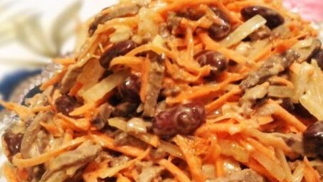 В этой статье я расскажу, как приготовить интересный и очень вкусный салат, основными ингредиентами которого являются говяжья печень и фасоль. Вполне возможно он займет постоянное место на вашем праздничном столе наряду, либо вместо популярных "Оливье" и "Под шубой". Нам понадобится: 300 гр. отварной говяжьей печени, 200 гр. вареной красной фасоли, 2 моркови, 1 луковица (крупная), 5 ст. л. майонеза, 3 ст. л. растительного масла, 2 ч. л. молотого кориандра, 2 ч. л. уксуса (9%) и соль по вкусу. Обрабатываем отварную печень: убираем пленки и нарезаем соломкой...