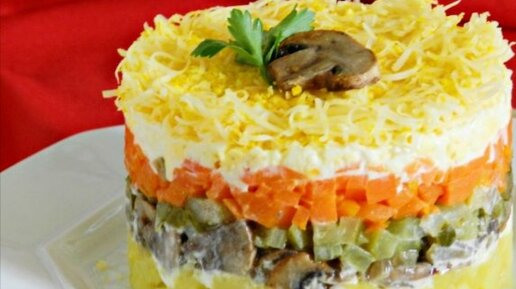 Картофель - 2 шт.Морковь - 1 шт.Яйца куриные - 3 шт.Шампиньоны свежие - 250 гЛук репчатый - 1 шт.Огурцы маринованные - 2-3 шт.Сыр - 50 гСоль - по вкусуПерец черный молотый - по вкусуМайонез (для заправки...