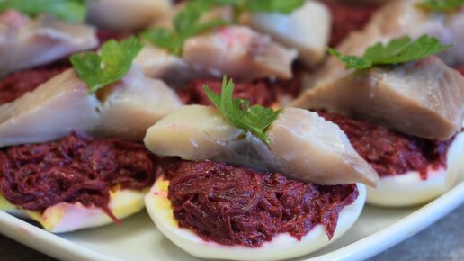 Ингредиенты: Яйца - 6 шт. Майонез - 2 ст. л. Горчица - 1 ч. л. Свекла - 1-2 шт. (~250-300 г.) Чеснок - 1-2 зубчика Филе сельди - 100 г. Листья петрушки Соль по вкусу Лимон Рецепт приготовления: Яйца разрезать пополам. Яичные желтки размять вилкой и смешать с майонезом и горчицей. Фаршируем назад половинки яиц. Вареную свеклу натираем на мелкой терке, добавляем чеснок через мресс, майонез и соль, перемешиваем. Сверху яйца кладем слой свеклы, потом кусочек соленой сельди и украшаем петрушкой. Получается шикарная закуска на любой праздничный стол...