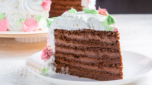 В этом торте нежные песочные шоколадные коржи сочетаются со сметанно-шоколадным кремом. Это восхитительно вкусно! Несложное и эффектное украшение белковым кремом всегда вызывает восхищение гостей. Равнодушных к такому торту точно не останется.
