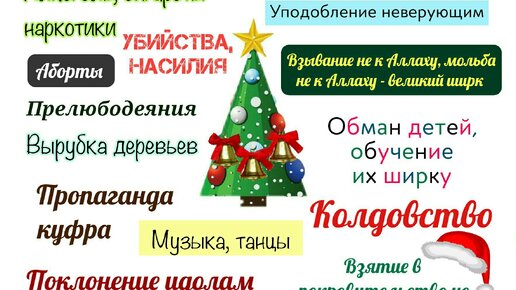 1. Ширк (придавание Аллаху сотоварища) Многобожие. А) Таваф (обход) вокруг идола — ширк. Дети, которые пляшут вокруг елки, делают таваф вокруг нее, совершают старейший языческий обряд, который ненавистен Аллаху. Единственным узаконенным тавафом является обход Каабы во время Хаджа. Нельзя совершать ритуальный обход вокруг чего-либо, кроме Каабы. Аллах говорит в Коране: « … и пусть они совершают обход Древнего дома (т.е. Каабы) (сура «аль-Хадж», аят 29). Все остальные обходы, будь то обход могил, деревьев или новогодних елок — ширк и поклонение шайтану...