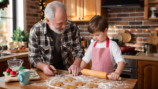 Дедушка учит внука печь пряники перед Рождеством. Мальчик приезжает к дедушке в деревню за неделю до праздника.