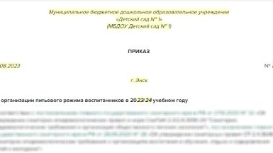 Эксперты Системы Образование (входит в Актион Образование) составили готовый образец приказа об организации питьевого режима воспитанников в детском саду на 2023-2024 учебный год. Издайте приказ об организации условий для питьевого режима воспитанников в 2023-2024 учебном году. Укажите способ питьевого режима — стационарные питьевые фонтанчики, устройства для выдачи воды, упакованная питьевая или кипяченая вода. Пропишите места раздачи питьевой воды и перечислите поручения для ответственных сотрудников...