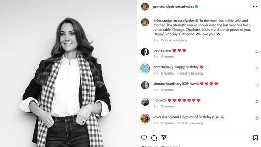 Принц Уэльский поздравил супругу - Кэтрин, принцессу Уэльскую с днем рождения, назвав ее "самой невероятной женой и матерью". "Самой невероятной жене и маме. - написал принц Уильям обращаясь к Кэтрин. - Сила, которую ты проявила за последний год, была замечательной. Джордж, Шарлотта, Луи и я так гордимся тобой. С днём рождения, Кэтрин. Мы любим тебя. В" Милое послание было опубликовано вместе с новой, ранее невиданной фотографией принцессы Уэльской, сделанной Мэттом Портеусом в Виндзоре прошлым летом...
