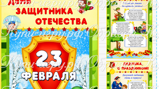 В комплекте: 7 листов - история праздника, поздравления и стихи для мальчиков, пап и дедушек. - Шаблоны можно скачать в нашей группе Вконтакте после оформления подписки ВК Донат (стоимость подписки - 95 рублей в месяц).