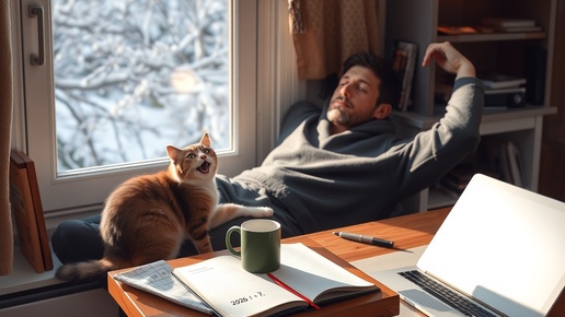 → Зарядка — уже интенсивнее. Всё это время рядом — Софья, кошка (брат уехал отдыхать — меня оставили за котами присматривать😊)...