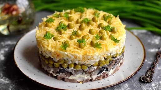 Салат Герцог — великолепное блюдо для торжественного стола. Он имеет аппетитный внешний вид и отменный вкус. Сытный и питательный мясной салат можно подавать на стол, как отдельное блюдо. В качестве мяса используется ароматная отварная говядина, ее дополняют жареные грибы, консервированных горошек, яйца и сыр. Компоненты выкладываются слоями, поэтому хорошо чувствуется вкус каждого продукта по отдельности. Если заранее подготовить все ингредиенты, то салат можно собрать за 15 минут, как раз перед приходом гостей...