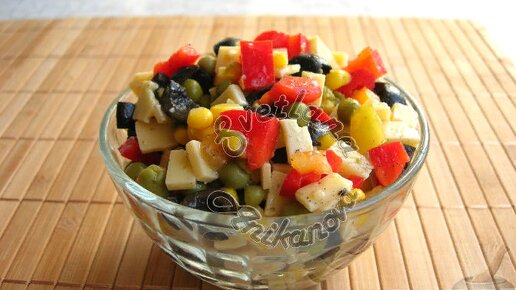 Праздничный салат с сыром, сладким перцем, кукурузой готовится без майонеза, с легкой заправкой, которая дополнительно придает салату свежесть. Готовится салат очень быстро, ему не нужно настаиваться. Он выгодно и ярко смотрится на праздничном столе...