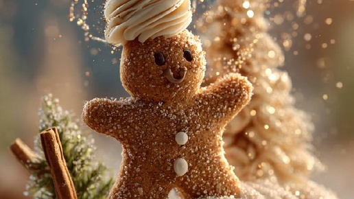 Christmas magic visualization of a gingerbread recipe. A dancing nutmeg sprinkle dusts snow over cookie dough, a cinnamon stick becomes a tiny Christmas tree, animated festive joy. Whimsical, fantasy, in a style of a magical Christmas storybook, glittering details...