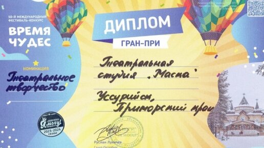 Коллектив детской театральной студии «Маска» подвёл итоги прошедшего года. Лучшим достижением стала недавняя поездка в Великий Устюг, где состоялся конкурс «Время чудес». Приморский театр получил высшую награду на российском конкурсе. На конкурсе «Время чудес» детская студия показала себя в трех возрастных группах - с 5 до 7лет, с 8 до 10 лет, с 10 до 12 лет. Представили три отрывка из спектаклей - «Сладкое королевство», «Лесная сказка» и «Сказка без подсказки». Получили высшую награду – гран-при - на весь коллектив...