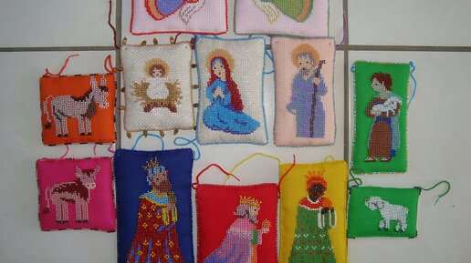 Вышивала я свой вариант вертепа. Схемы сама составляла, а идеи искала и брала в интернете Все вышито бисером по канве, а на обратной стороне вышила крестиком имена, кто вышит Вот так можно повесить и на елку и на стену...
