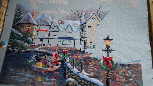 В январе этого года я начал вышивать еще одну масштабную работу - "Рождественскую бухту" по набору Dimensions. Напомню немного, что это за вышивка и на каком этапе она тогда остановилась. Это старый (и уже раритетный) набор, в котором мулине нужно было разбирать по номерам самому, но бумажные органайзеры были в комплекте. В наборе канва 16 каунта, а итоговый размер этой вышивки должен быть 46х36см. Использую раму станка 57х42см, переместив верхнюю планку на одно деление вниз, в итоге передо мной участок канвы размеров 57х40см...