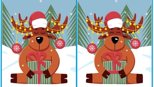 Добрый день читатели канала! Всё чаще за окном идёт снег и в связи с этим мы решили разбавить ленту зимними картинками. Вашему вниманию предлагается рисунок с двумя похожими друг на друга карточками на которых изображён рождественский олень. Участникам теста на внимательность представляется возможность сравнить их между собой и найти вероятные отличия. Взгляните на картинку и постарайтесь определить, где прячутся шесть отличий. Чтобы полностью выполнить задание найдите все различия, если увидите меньше не унывайте наверняка получится в следующий раз...