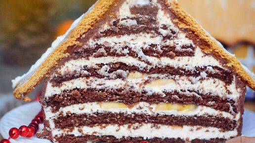 Торт "Рождественский домик": шоколадный торт с бананом на Новый год 2023