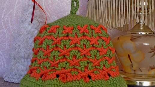Для работы нам понадобятся крючок, пряжа красного и зеленого цвета. Для основного узора используем узор «Польская звезда» Длину цепочки вяжем в зависимости от обхвата вашего чайника в районе носика и ручки На чайник объемом 50 см. я набрала 130п. Т.к. узор стягивается,то надо еще добавлять петли, чтобы грелка хорошо «садилась» на чайник. С 1-3 ряд вяжем столбиками с 1 накидом, затем меняем нить на розовую и переходим на узор «польская звезда» Высоту изделия регулируйте в зависимости от вашего чайника...