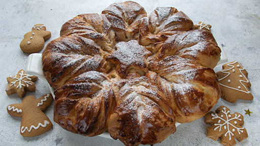 Сдобный дрожжевой пирог красивой формы с начинкой. Приготовить опару. Молоко подогреть, добавить чайную ложку сахара. Раскрошить дрожжи и размешать их в теплом молоке. Затем добавить 4-5 столовых ложек муки (из общего количества) и замесить жидкое тесто (опару). Опару накрыть пленкой или полотенцем и поставить в теплое место на полчаса. Смешать яйца с сахаром, солью, ванильным сахаром и размягченным сливочным маслом. Добавить эту смесь в подошедшую опару. Перемешать и постепенно добавить муку. Замесить...