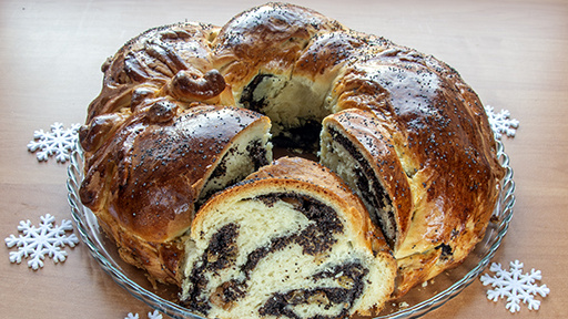 Сдобный дрожжевой пирог с маком и изюмом. Приготовить маковую начинку. Промыть мак водой, откинуть на сито, слить воду. Залить мак холодной водой так, чтобы уровень воды был на два пальца (3-3,5 см) выше уровня мака. Довести до кипения и кипятить на среднем огне, пока не выкипит вся вода (примерно 45 минут). Когда вода выкипит, снять с огня и смешать мак с сахаром. Пробить смесь погружным блендером. Добавить яичный белок к маку (желток оставить для смазки венка) и немного взбить смесь погружным блендером...