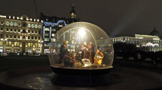 Многие петербуржцы и гости города проходя по Невскому проспекту наверняка видели интересный прозрачный шар с библейской сценкой внутри него. Шар, напоминающий зорб, можно было видеть в период новогодних и рождественских праздников, вот он: Шар стоит к нам спиной, но подойдя к нему стороны Казанского собора можно увидеть саму сценку: Что здесь изображено и в чём смысл? Согласно дошедшим до нас текстам евангелистов, Иосиф и уже беременная Мария, с которой он был обручён, прибыли в город Вифлеем на перепись населения, которая тогда проводилась...