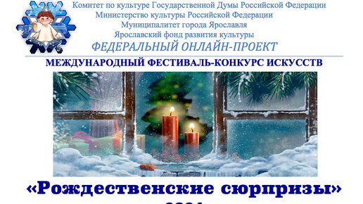 Комитет по культуре Государственной Думы Российской Федерации Министерство культуры Российской Федерации Муниципалитет города Ярославля Ярославский фонд развития культуры ФЕДЕРАЛЬНЫЙ ОНЛАЙН-ПРОЕКТ МЕЖДУНАРОДНЫЙ ФЕСТИВАЛЬ-КОНКУРС ИСКУССТВ «Рождественские сюрпризы» 2024 дистанционный̆ конкурс с представлением фото/видео-записи Приём заявок: до7 января2024 г. Даты проведения конкурса: 3-7 января2024 г. К участию приглашаются: Вокальные ансамбли эстрадного, академического, джазового, народного пения,...