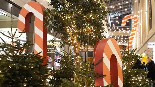 И вновь я довольна тем, что вижу, входя в один из самых дружелюбных для блогеров торговых центров Риги, расположенный в Старом городе и долгое время мучивший меня своим креативным оформлением. На прошлое Рождество они уже радовали нас старой доброй классикой в виде украшенных золотистыми гирляндами живых ёлочек и внешним оформлением (витрин) в античном стиле, в этом же, видимо, решили продолжить традицию, выбрав в качестве центрального элемента оформления – гигантские рождественские карамели-трости...