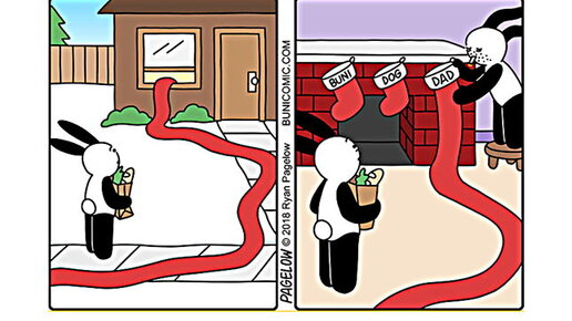 Все шутки в этот раз построены на том как чёрно-белый кролик оптимист готовится к предстоящим праздникам. А вот его папа - пессимист им не рад. Зачем столько суеты, трат, подготовки? Что за праздничное настроение? Он о таком не слышал. Да, кстати в мире где всё шиворот - навыворот и Санта Клаус с оленями странные и способны на причуды. Нескучные комиксы Райана Пейджлоу (Ryan Pagelow) нарисованы в стиле детского мультика, но шутки для взрослых читателей. Добро пожаловать в безумный мир BUNICOMIC! Здесь может произойти что угодно...