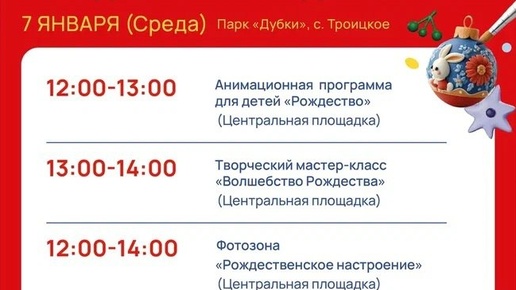 ✨ Рождество в парке Дубки Анимационная программа, творческий мастер-класс и самоварная станция 🫖🥨 🚫 Возраст: 0+ 📆 07.01.2026 🏢 Парк культуры и отдыха «Дубки» 📍 г.о.Чехов, с.Троицкое, парк "Дубки" 🪙 Вход свободный❗️ ⭐Поддержать канал голосом ✅ Мероприятия Чехов https://dzen...