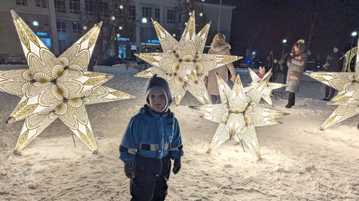 Что делать в новогодние каникулы? Салат и куру доели, Нарнию и Приключения Маши и Вити посмотрели. Морозы спали и мы нацелились погулять в городе. Непременно вечером - земляки отзывались, что в этом году город украшен очень красиво. И самим посмотреть хочется, и старших от компьютеров отодрать, и Лёню развлечь "огонечками". Соблазнили старших обязательным посещением пиццерии, загрузили машину детей и двинули. Действующие лица: Муж Андрей; Денис - 17 лет; Артем - 14 лет; Лёня - 3 года; Женя - 0 лет...