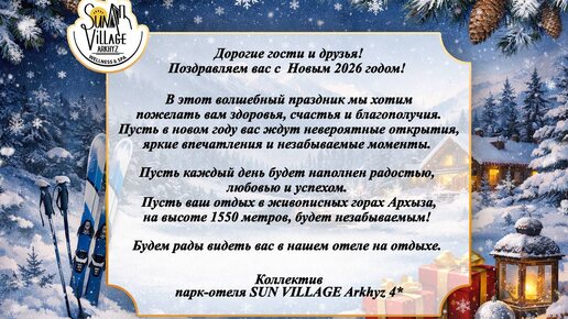 парк-отель SUN VILLAGE Arkhyz 2 недели назадПодписатьсяДорогие друзья, поздравляем ВАС с наступившим Новым годом и Рождеством! 🎄 Счастья, благополучия, здоровья и новых впечатлений! Ждём ВАС в горах Архыза! санвилладж.рф