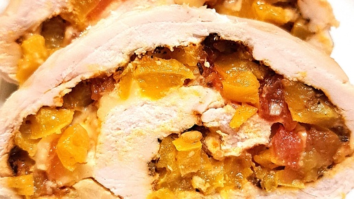 Праздничный куриный рулет с начинкой из овощей и сыра. Получилось сочно и вкусно!