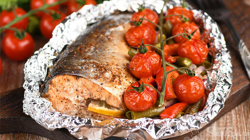 Такая рыба с овощами отлично подойдет и для праздничного стола. Красивый вид придают веточки помидоров черри. Их можно заменить и на обычные томаты. Овощи можно использовать любые, но только они должны быстро готовиться...