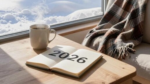 ! ☕️ В первый день нового года предлагаем создать образ уютного утра в зимнем загородном доме — идеальную картинку для спокойного начала 2026. 📝 Оптимизированный промт: A cozy, sunlit morning in a modern Scandinavian-style cabin on January 1st. Wide window view of a pristine, snow-covered pine forest under a clear blue sky. Inside, a minimalist interior with light wood textures, a steaming mug of coffee or tea on a wooden table next to an open notebook with the numbers "2026". Soft, warm morning...