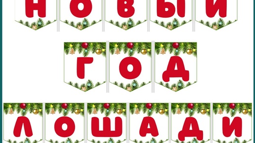 Бесплатные шаблоны для распечатки флажков с буквами и лошадками. Из них мжно составить гирлянду с фразой "Новый год Лошади 2026". Всего есть три варианта дизайна: Вариант 1 - классические флажки для гирлянды С новым годом...