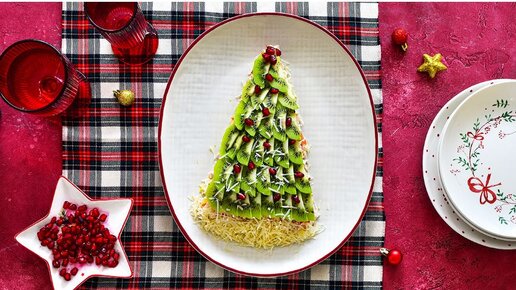 Салат Елочка на Новый год станет настоящим украшением вашего праздничного стола. Вот увидите: ваши близкие и гости по достоинству оценят это оригинальное и очень вкусное блюдо. Рецепт салата прост: отварное куриное филе, ананасы, морковь, тертый сыр и яйца выкладываются слоями в виде елочки (каждый промазывается майонезом), а затем сверху распределяются ломтики киви, которые и завершают главную идею блюда. Осталось только украсить блюдо «шариками» из зерен граната и оправить в холодильник примерно на полчаса...