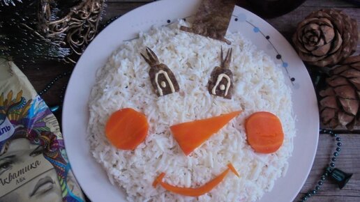 Отличный и легкий салат на Новогодний стол. Совершенно простой салат, но украшенный в виде снеговичка привлечет внимание ваших гостей. Ингредиенты для «Салат "Снеговик"»: Время приготовления: 45 минут Количество порций: 6 Рецепт «Салат "Снеговик"»: Рис Акватика Микс отварить до готовности в подсоленной воде. Отварить вкрутую яйца, остудить и очистить. Морковь отварить. Крабовые палочки мелко нарезать. Яблоки очистить от сердцевины и кожуры и нарезать небольшими кусочками. У отварных яиц отделить белки от желтков...
