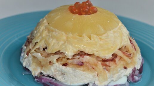 Представляю превосходное сочетание простых и доступных продуктов, которое запомнится Вам надолго. Праздничный салат побалует своим великолепным вкусом и наверняка станет одним из самых желанных на столе. Этот рецепт дополнен удивительным продуктом, который придаст ему гармоничный привкус. (Красная икра - лишь для украшения и совершенно не обязательна) Салат очень прост в приготовлении и нам потребуется (для 6 персон): филе любой птицы - 400 гр, яйца куриные - 5 шт, сыр - 200 гр, два яблока, луковица, майонез и немного...