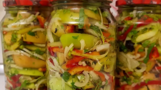 Салат из сладкого перца, зеленых помидоров с луком и морковью Предлагаю проверенный годами рецепт очень вкусного салата из пер Ингредиенты: 2 кг.зеленых помидоров, 1 кг.болгарского перца, 1 кг.репчатого лука, 1 кг.моркови, 70 г.соли, 1 ст.л.сахарного песка, 1 ст. 9% уксуса, 1 ст.растительного масла, Приготовление: Желательно взять стручки перцев разных цветов. Красный и желтый, перцы промываем, удаляем плодоножки и семена. Еще раз промываем и нарезаем в свободной форме. Зеленые помидоры сортируем, моем, удаляем плодоножку и режем ножом на доске на кружочки...