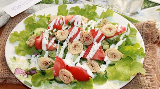 Блюдо получается нарядным и эффектным. Сочное сочетание сезонных овощей с миниатюрными рулетиками из тонких блинчиков свежо и необычно. Богатый витаминный состав делает кушанье полезным, а сметанная заправка – сытным. Рецепт прост и не требует особых навыков. Ингредиенты: Приготовление Овощи моем и просушиваем. Количество их произвольно и может варьироваться в зависимости от наполнения холодильника и предпочтений хозяйки. Листья салата оставляем целыми, если они небольшие. Крупные просто рвем руками...