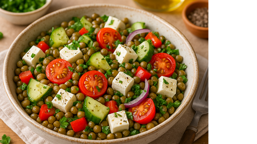 Салат с чечевицей, сыром и овощами — сытный, свежий и яркий вариант для полезного обеда или ужина