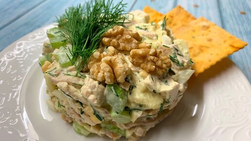 Супер простой, сытный и вкусный салат на каждый день. Подойдет даже на праздничный стол! Смотрите видео или читайте пошаговый рецепт ниже. Ингредиенты в конце рецепта. Заходите на мой канал в Youtube. Жду ваших комментариев ;) Пошаговый рецепт салата: 1. Заранее отварите одну куриную грудку. Нарежьте на тонкие слайсы или соломкой. 2. Вареные яйца мелко нарежьте. 3. Мелко нарежьте сельдерей. 4. Яблоко очистите от кожуры и сердцевины. Нарежьте на слайсы или соломкой. 5. Грецкий орех мелко нарубите ножом или положите в пакет и отбейте скалкой...
