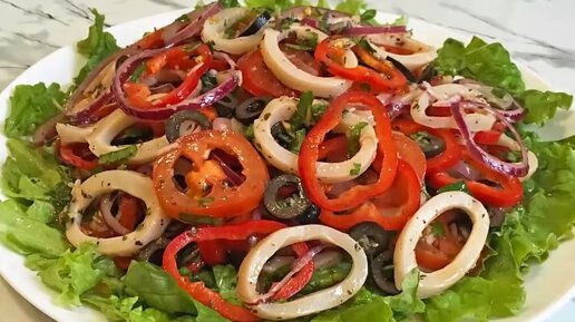 Ингредиенты: Доброго времени суток, дорогие друзья! Сегодня я покажу лёгкий праздничный салат. Он прост в приготовлении и неприхотлив в ингредиентах. Такое блюдо украсит и вечеринки, и постный стол. Для начала подготовим главный ингредиент – кальмары. Чистить и готовить их мы будем не обычным способом. Чтобы избавиться от плёнки, достаточно положить кальмары в какую-либо ёмкость и залить крутым кипятком, а затем сливаем. Такие действия проделываем несколько раз, пока вы не увидите, как слезает кожица с кальмаров...