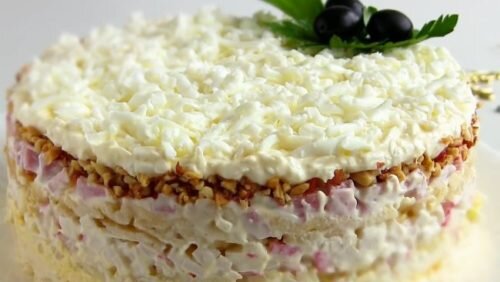 Нежный слоеный салат с ветчиной и крабовыми палочками — Снежная королева