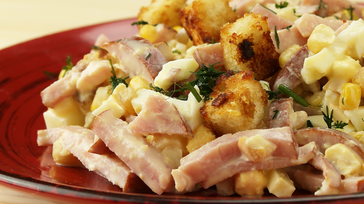Ингредиенты: Ветчина - 250 г; Сыр косичкой (Чечил) - 100 г; Яйцо - 5; Консервированная кукуруза - 200 г; Чесночные сухари - 200 г; Майонез Видео: Рецепт праздничного салата с ветчиной, сыром косичкой и чесночными сухариками...