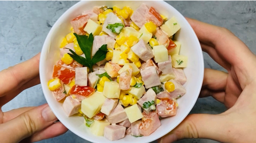 Салат с ветчиной, сыром, кукурузой и помидорами - яркий и вкусный салат для любого повода