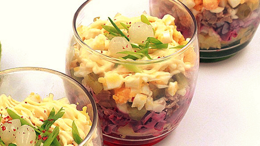 Пусть это немного сложнее, чем просто все перемешать, зато будет выглядеть очень эффектно и празднично. Готовим закуску заранее и ставим для пропитки в холодильник. Ингредиенты для салата: Расчет примерно на 8 порций Шаг 1 Тунец можете брать в собственном соку или в масле. Картофель, яйца и свеклу лучше отварить заранее...