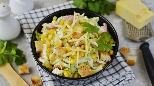 Этот салат можно подать и к повседневному ужину, и на праздничный стол. Готовится он на скорую руку, а если присмотреться к ингредиентам, то можно понять, что получится сытным и гармоничным. Сочная пекинская капуста, сладкая кукуруза, хрустящие чесночные гренки, колбаса, сыр - вкусно по отдельности и очень вкусно в сочетании. Берите на заметку! Приятных вам хлопот на кухне! Ставьте лайк и подписывайтесь на канал «Fresh Recipes» в Яндекс Дзене, чтобы не пропускать наши новые публикации. А также присоединяйтесь к нам на нашем сайте fresh...