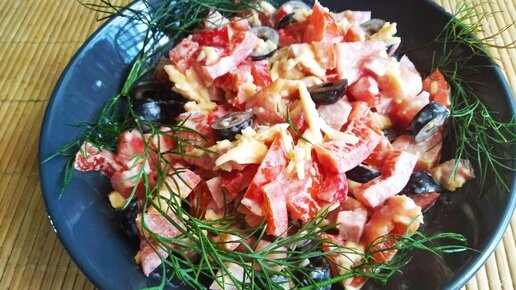 Быстрый и вкусный салат с копчёной колбасой, болгарским перцем и помидорами