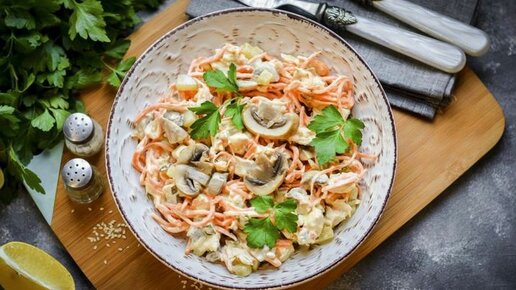 Салат с курицей, морковью по-корейски и маринованными грибами. Приготовлю его на Новый год!