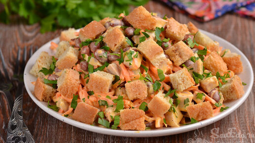 Праздничный, хрустящий и очень вкусный салат с корейской морковью, курицей, консервированной фасолью и сухариками. Для большего аромата добавляю петрушку, в качестве заправки использую майонез. Сухарики за 3 минуты подсушиваю в микроволновой печи. Салат готовится очень быстро, если использовать заранее отваренную или запеченную куриную грудку или окорочок. Салат приобретает легкую остроту от моркови по-корейски и становится очень сытным от фасоли и куриного филе. Порции 5 Время подготовки 15 минут Время приготовления 10 минут Ингредиенты Инструкции 1...
